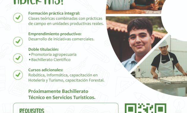 La propuesta académica incluye doble titulación en Bachillerato Técnico Agropecuario y Técnico en Hotelería y Turismo, junto con cursos de robótica, informática y manejo de drones, que incorporan la innovación tecnológica en la formación rural.