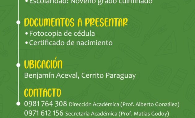Requisitos: tener entre 15 y 17 años, haber culminado el noveno grado, y presentar fotocopia de cédula y certificado de nacimiento.