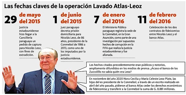 De acuerdo con el acta de imputación, el entonces presidente de la Conmebol Nicolás Leoz realizó en el año 2013 varios depósitos de dinero en dólares, gua­raníes y firmó contratos de fideicomisos. Los depósi­tos que realizó Leoz y que el banco Atlas nunca soli­citó ninguna documenta­ción son USD 5.100.000, más la suma en guaraníes de G. 16.000 millones y los contratos de fideicomiso de USD 2 millones y G. 22.000 millones.