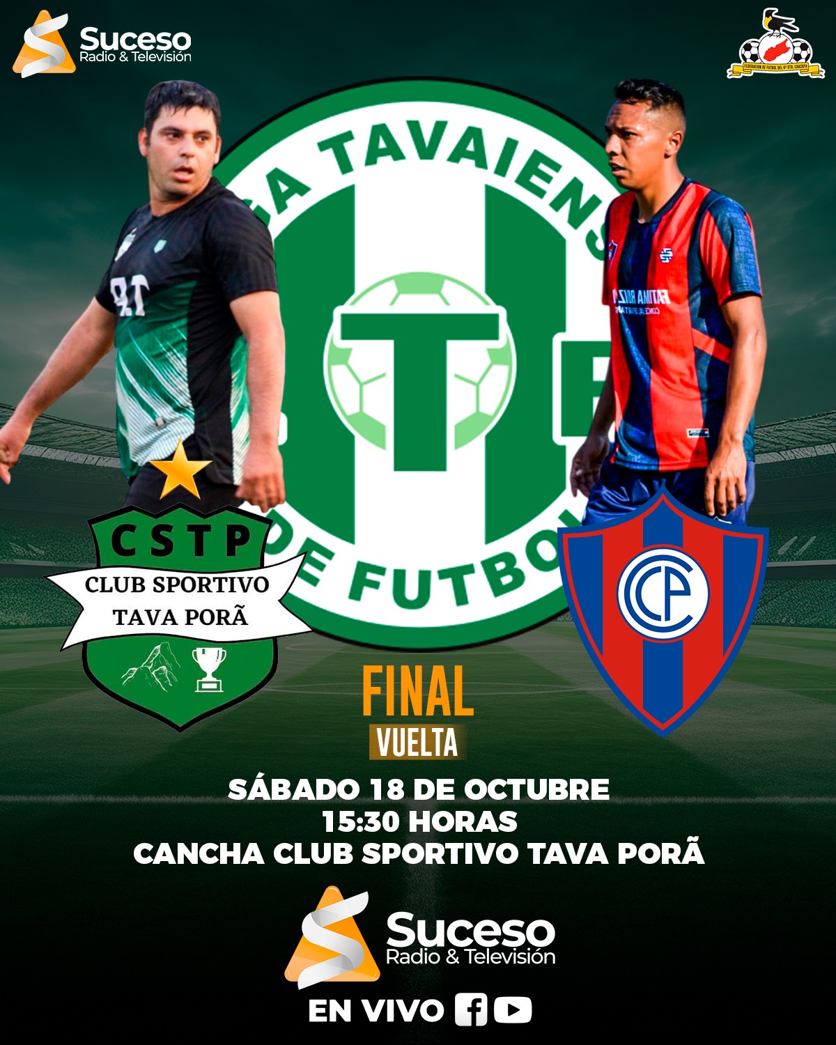 El esperado duelo entre Sportivo Tavaporã y Cerro Porteño de Enrramadita se jugará este sábado desde las 15:30 hs, y podrás disfrutarlo EN VIVO por todas las plataformas de Suceso Radio y Televisión.