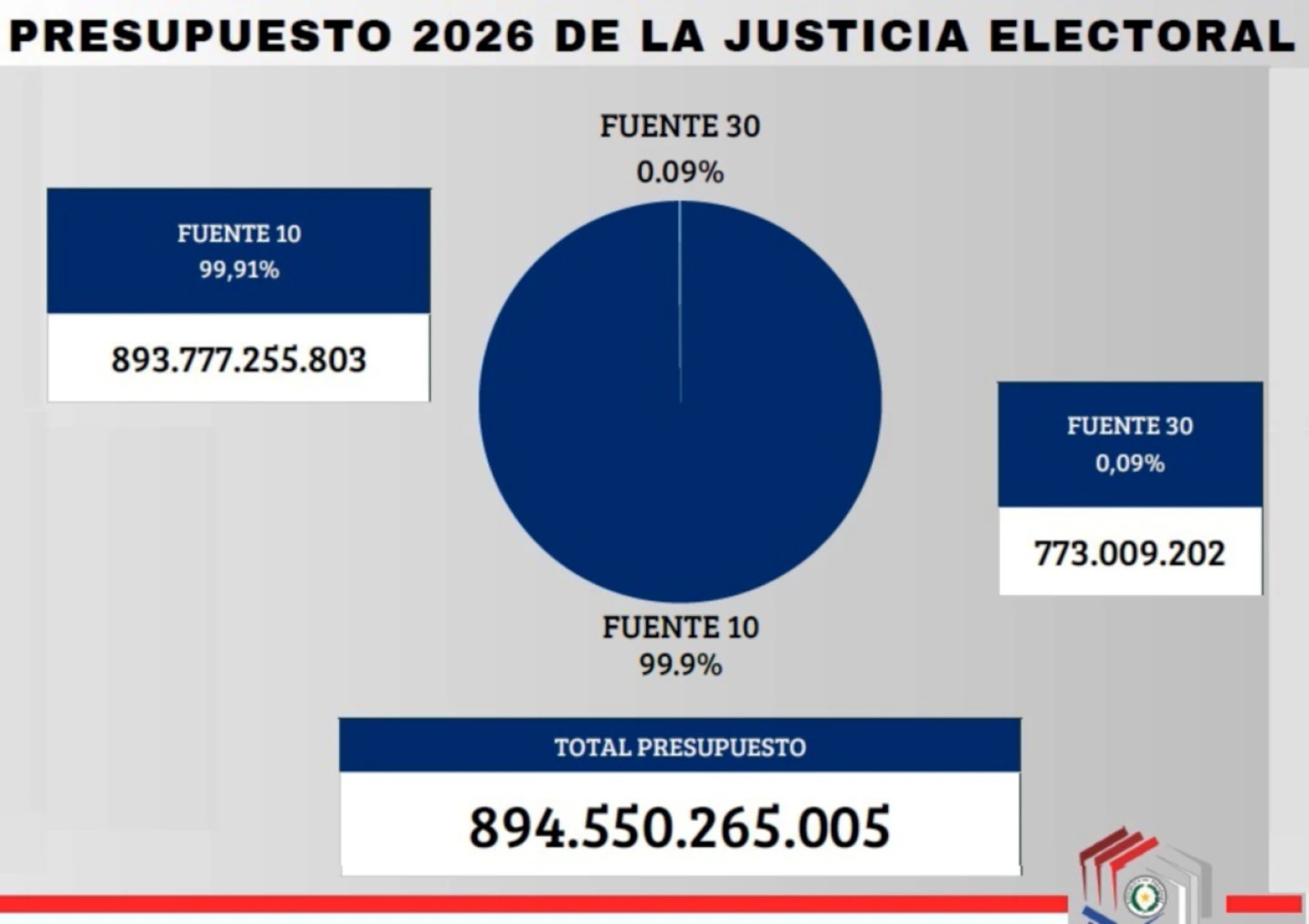 El presupuesto solicitado ayer para el TSJE es de G. 894.550.265.005, con un 99,9% que será proveniente de Fuente 10, y con aumento del 20% respecto del presupuesto anterior.
